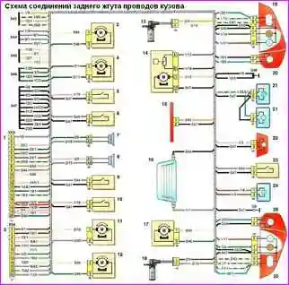 1, 2 — pads for connection with the front harness of the body; 3 - electric lock of the right rear door; 4 - power window of the right rear door; 5 - limit switch for the lamp of the ceiling light at the right front door; 6 - limit switch for the lamp of the interior lighting dome at the right rear door; 7 - right rear speaker; 8 - left rear speaker: 9 - limit switch for the ceiling lamp for interior lighting at the left rear door; 10 - limit switch for the lamp of the ceiling light at the left front door; 11 - power window of the left rear door; 12 - electric lock of the left rear door; 13 - speed sensor of the right rear wheel; 14—fuel module; 15 - additional braking signal; 16 - rear window heating element; 17 - electric drive for locking the trunk lid; 18 - speed sensor of the right rear wheel; 19 — right rear light on the wing; 20 - right rear light on the trunk lid; 21 - license plate light; 22 - rear fog lamp; 23 - limit switch for the trunk light; 24 - dome lighting trunk; 25 — left rear light on the wing; 26 - left rear light on the trunk lid