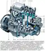 Five-speed gearbox: 1 - input shaft; 2 - bearing cover; 3 - cuff of the input shaft; 4 - retaining ring; 5 - ball bearing of the primary shaft; 6 - roller bearing of the secondary shaft; 7 - spline crown of the input shaft: 8 - blocking ring; 9 - clutch of the synchronizer of III-IV gears; 10 - clutch hub; 11 - key; 12 - splined crown of the gear of the third gear; 13 - third gear gear; 14 - gear bushing; 15 - second gear gear; 16 - crankcase; 17 - second gear bushing; 18 - splined ring gear of the second gear; 19 - synchronizer clutch II-I gears; 20 - splined ring gear of the 1st gear; 21 - gear 1st gear; 22 - bushing gear 1st gear; 23 - roller bearing of the secondary shaft; 24 - output shaft sleeve; 25 - driven gear V gear; 26 - crankcase V transmission; 27 - double-row ball bearing of the secondary shaft: 28 - slotted washer; 29 - retaining ring; 30 - secondary shaft; 31 - bolt; 32 - disc spring, 33 - support ring; 34 - drive gear V gear; 35 - splined crown of the drive gear of the 5th gear; 36 - synchronizer spring; 37 - synchronizer cracker; 38 - clutch synchronizer V transmission; 39 - ball bearing of the intermediate shaft; 40 - roller bearing of the reverse gear; 41 - reverse gear; 42 - axis of the reverse gear; 43 - gear block for the drive of the intermediate shaft and III gear; 44 - intermediate shaft; 45 - roller bearing of the intermediate shaft; 46 - bearing cover