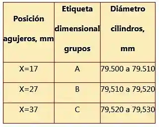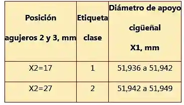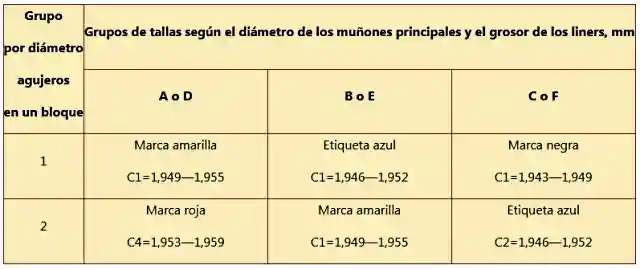 El tamaño de los diámetros de los soportes de los cojinetes principales en el bloque de cilindros se indica en la tabla 2.