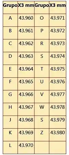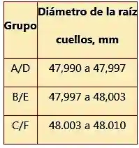 Grupos de tamaño según el diámetro de los muñones de biela: