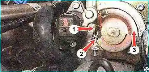 Проверяем положение дроссельной заслонки. При отпущенной педали акселератора упор 1 на оси заслонки должен касаться головки регулировочного винта 2, что соответствует закрытому положению дроссельной заслонки.