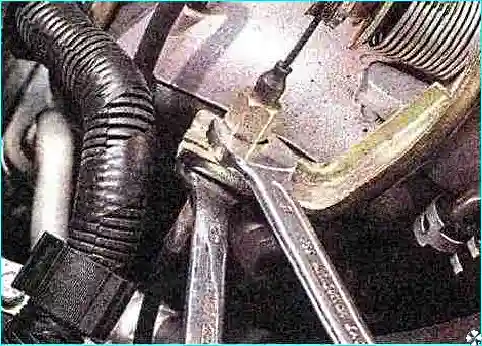 При необходимости ключом на 12 мм ослабляем контргайку, удерживая от проворачивания гайку оболочки троса ключом на 13 мм. Вращая гайки, немного перемещаем наконечник в кронштейне, в сторону сектора привода заслонки, если она не открывалась полностью и от заслонки, если она не закрывалась.
