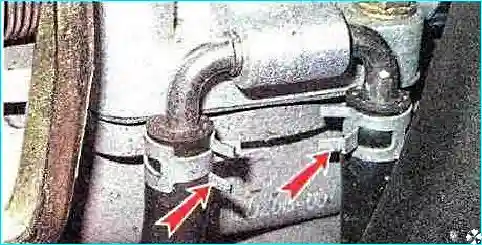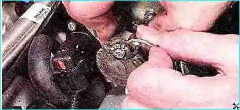 Замечание: При необходимости для полного снятия пассатижами ослабляем хомуты двух шлангов подогрева дроссельного узла и, сдвинув хомуты по шлангу, снимаем шланги с патрубков и глушим их болтами М8. При отсоединении шлангов от дроссельного узла выльется около 0,5 литров охлаждающей жидкости. Следует подложить под дроссельный узел ветошь для сбора жидкости. После сборки необходимо довести уровень жидкости до нормы.