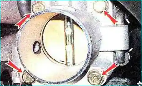Торцовым ключом на 12 мм откручиваем четыре болта крепления и отводим дроссельный узел от впускного трубопровода