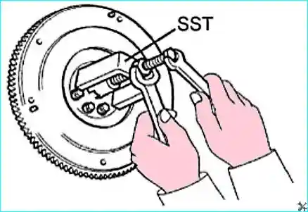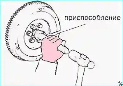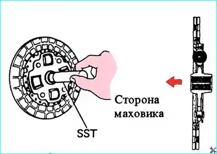 Используя специальное приспособление, установить диск сцепления на маховик.
