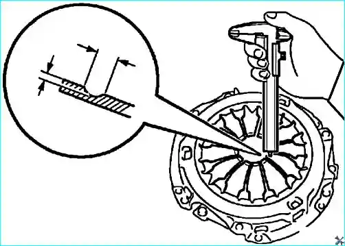 Проверить диафрагменную пружину на износ и наличие повреждений. Штангенциркулем измерить износ и ширину пружины диафрагмы.
