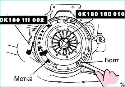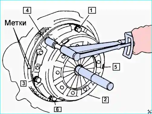 Примечание: Перед снятием диафрагменной пружины нанести метки на кожух и маховик.