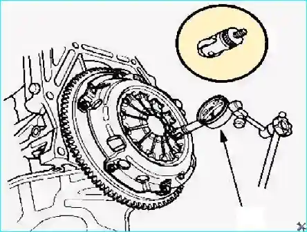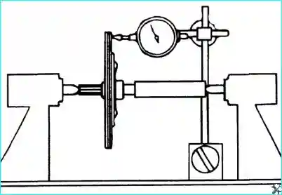С помощью индикатора часового типа измерить биение диска сцепления. Предельное значение биения диска 0.8 мм. При превышении предельно допустимого значения заменить диск сцепления.