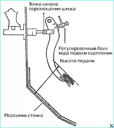 Проверить высоту педали в свободном состоянии и высоту, на которой начинается выключение сцепление.