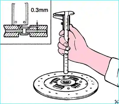 Проверить диск сцепления на наличие повреждений. Заклепки не должны выступать более чем на 0.3 мм. При обнаружении дефектов заменить диск сцепления.