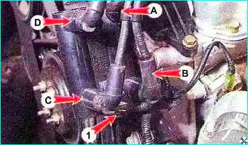 Нажав фиксатор, отсоединяем колодку жгута проводов 1 от катушки зажигания. Отсоединяем от выводов катушки высоковольтные провода (А, В, С и Д).