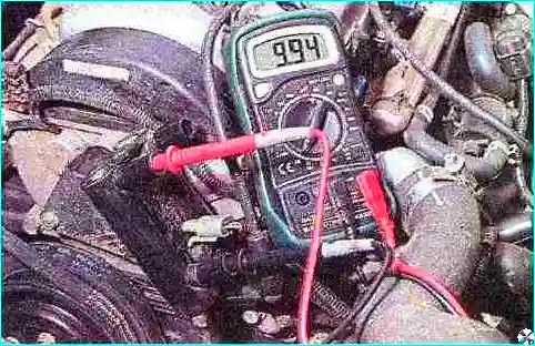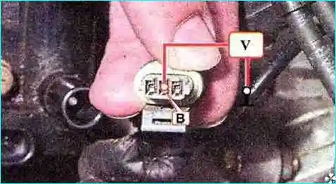 Подсоединяем щупы мультиметра в режиме вольтметра к контакту (В) колодки жгута проводов. При включении зажигания вольтметр должен показать напряжение аккумуляторной батареи. В противном случае проверяем электрическую цепь до реле зажигания Ег2