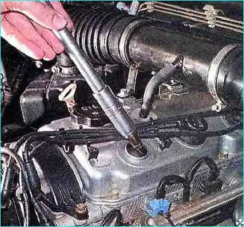 Свечным ключом на на 16 мм отворачиваем, извлекаем свечу из свечного колодца.