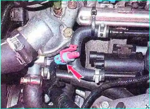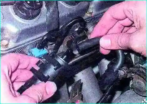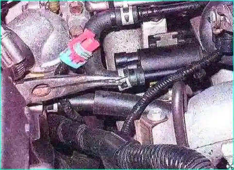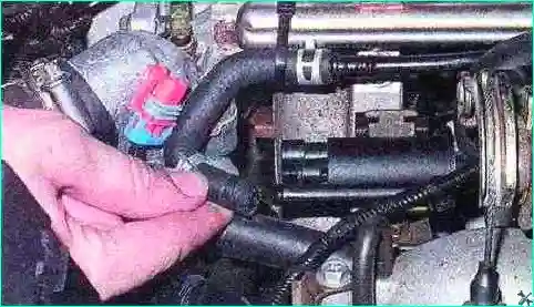 Освобождаем фиксатор и отсоединяем колодку жгута проводов от клапана продувки адсорбера.