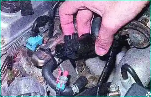 Снимаем топливную рампу в сборе с форсунками, потянув ее вдоль оси форсунок.