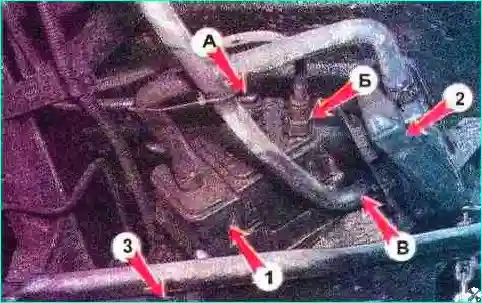 Нажимаем фиксаторы и отсоединяем от адсорбера трубки топливным баком (А) и впускным трубопроводом (Б). Сжимаем пассатижами хомут, сдвигаем его по шлангу (В) и снимаем шланг с патрубка ресивера 2.