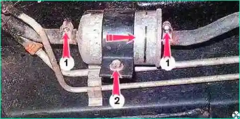 Шлицевой отверткой ослабляем хомуты 1 и отсоединяем от патрубков фильтра шланги топливопровода.
