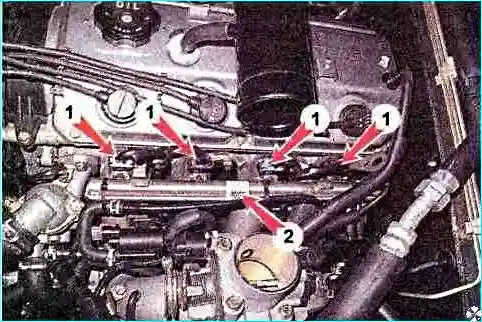 Снимаем шланг системы вентиляции картера 1, отсоединяем шланг 2 от регулятора давление топлива и шланг 3 от клапана продувки адсорбера. Отсоединяем колодки жгута проводов от форсунок 4. Торцовым ключом на 10 мм отворачиваем два болта крепления 5.