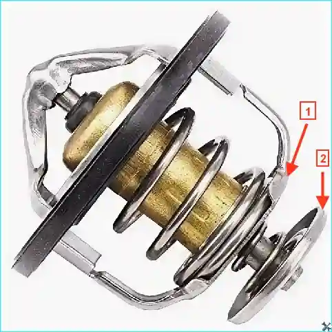 Измеряем глубиномером штангенциркуля размер между корпусом термостата 1 и плоскостью клапана 2.