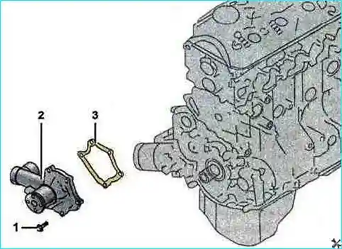 Насос крепится к блоку цилиндров пятью болтами. Соединение уплотняется прокладкой.