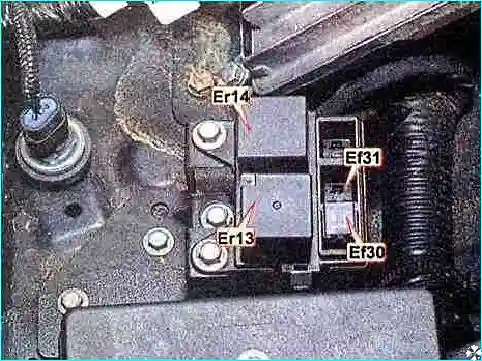 В этом блоке находятся два реле электровентилятора: реле высокой скорости Er13 и реле низкой скорости Er14. Цепи обоих реле защищает один предохранитель Ef30 40A.