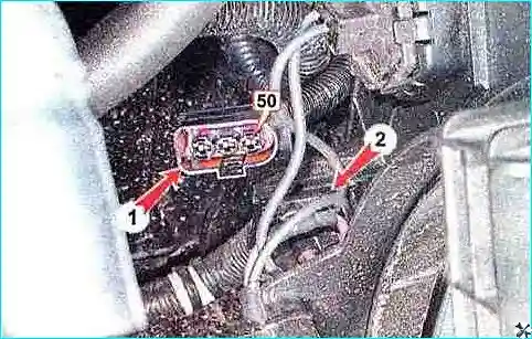 Если электровентилятор не работает ни на одном из режимов, проверяем мультиметром в режиме омметра сопротивление между выводом 50 колодки жгута проводов 1 и отрицательным выводом АКБ показания прибора должны стремиться к нулю. В противном случае необходимо устранить обрыв в цепи.