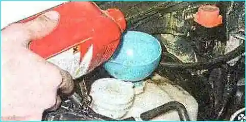 Через воронку доливаем предварительно приготовленную охлаждающую жидкость.