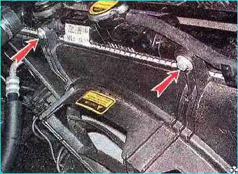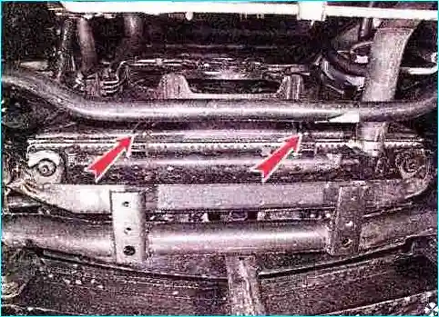 Наклоняем радиатор в сторону моторного отсека, поднимая его, выводим нижние держатели радиатора из отверстий и снимаем радиатор.
