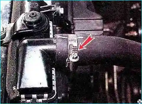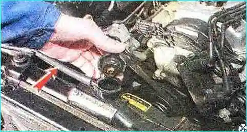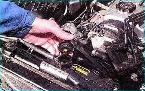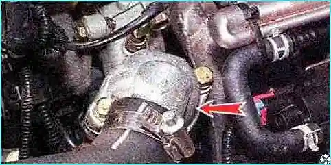 Замечание. Работу следует выполнять при холодном двигателе. При отсоединении патрубка, под которым находится термостат, из блока цилиндров может вытечь некоторое количество охлаждающей жидкости — подставьте под этим местом автомобиля емкость.