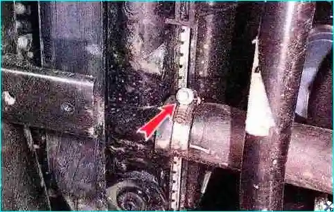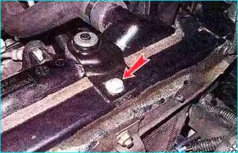 Торцовым ключом на 10 мм отворачиваем два болта крепления верхних кронштейнов радиатора (на фото показан левый).