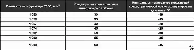 С помощью таблицы, по плотности антифриза определяем его концентрацию и минимальную температуру, при которой его можно эксплуатировать.