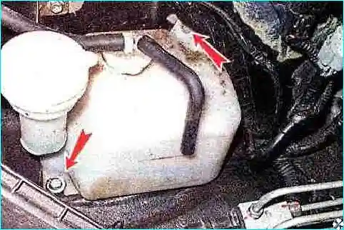 Снимаем крышку расширительного бачка, ключом на 10 мм отворачиваем болты его крепления, снимаем бачок и выливаем охлаждающую жидкость. Если в нем накопилось много отложений, промываем бачок, и устанавливаем на место.