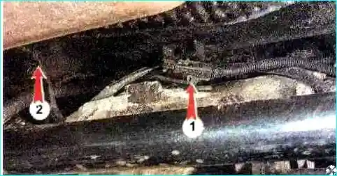 Отсоединяем колодку проводов датчика держателя на кузове и, освободив фиксатор, отсоединяем от нее колодку жгута проводов. Отсоединяем жгут проводов датчика от держателя на кузове 2.