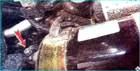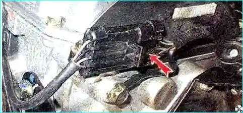 С правой стороны моторного отсека извлекаем разъем датчика из держателя на картере сцепления и отсоединяем жгут проводов от датчика.