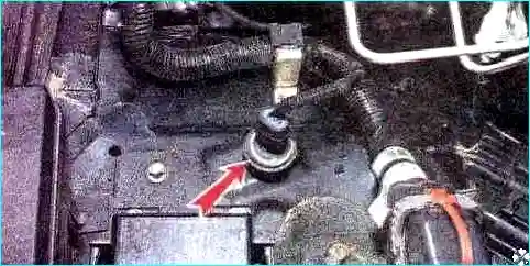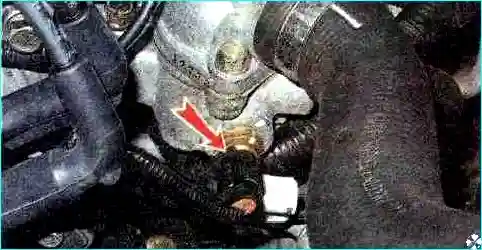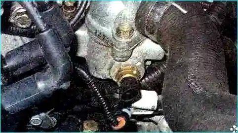 Освобождаем фиксатор и отсоединяем колодку жгута проводов от датчика температуры охлаждающей жидкости