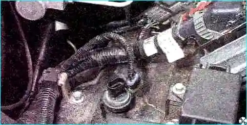 Освобождаем фиксатор и отсоединяем колодку жгута проводов от регулятора холостого хода.