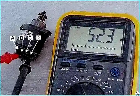 Замечание: Проверить датчик можно, измерив, сопротивление на его выводах (С красно-синий провод) и (D черно-желтый провод). У исправного датчика сопротивление при температуре 23 °С должно быть около 13 Ом.