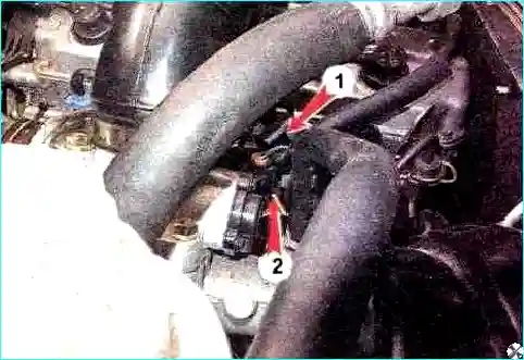 Освобождаем фиксатор и отсоединяем колодку жгута проводов 1 от датчика