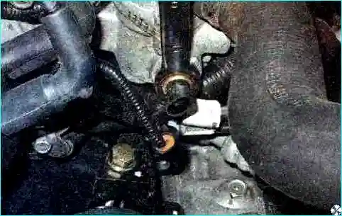 Освобождаем фиксатор и отсоединяем колодку жгута проводов от датчика детонации.