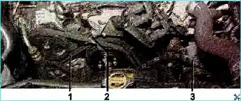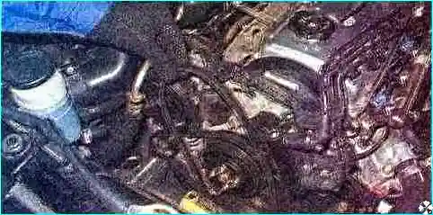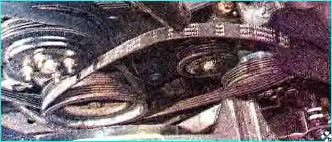 Привод каждого вспомогательного агрегата выполнен отдельным ремнем. Поскольку ремни установлены последовательно, для замены, например, ремня привода насоса гидроусилителя руля необходимо снять ремень компрессора климатической установки, а для замены ремня генератора — все ремни. Поэтому целесообразно заменять все ремни сразу. Но при необходимости можно заменять ремни и по отдельности. На ремни, которые будут повторно установлены, перед снятием следует поставить метки, указывающие направление движения ремня, чтобы при сборке установить их в прежнее положение. После снятия ремней следует проверить состояние соответствующих натяжных роликов и, при необходимости, заменить их.