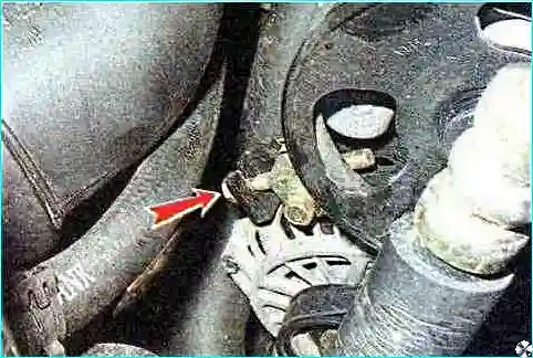 Ключом на 12 мм ослабляем гайку болта 2 нижнего крепления генератора и стопорный болт 1.