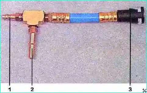 Переходник: 1 штуцер для подсоединения к топливопроводу; 2 штуцер для подсоединения манометра; 3 наконечник для подсоединения к топливной рампе