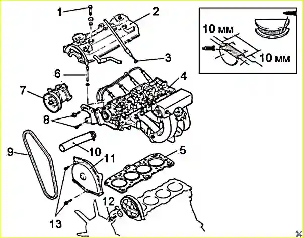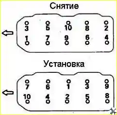 Отверните болты головки в порядке от периферии к центру (согласно рисунка 5) и снимите головку цилиндров.