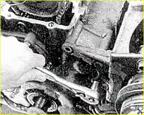 Отверните болт и снимите звездочку распределительного вала, уперев ее в нижнюю крышку. Надежно закрепите ремень на звездочке (рис. 4).