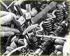 Установите приспособление для сжатия пружин клапанов и сожмите с его помощью пружину клапана (рис. 8). Выньте с помощью отвертки или пинцета два сухаря.