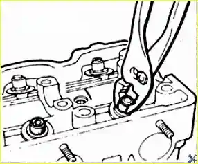 При необходимости снимите коллекторы. Очистите головку. Очистка головки заключается в удалении остатков уплотнения и нагара из камер сгорания и головок клапанов. При очистке пользуйтесь скребком из твердого дерева или из пластмассы (нанесение царапин не допускается). Одновременно очистите разъемную плоскость блока цилиндров, осторожно закрыв цилиндры ветошью.
