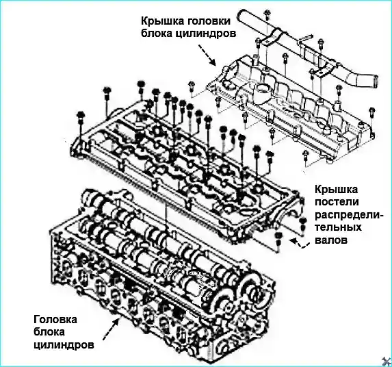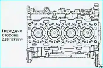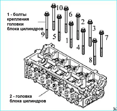 - - Поочередно ослабить и отвернуть десять болтов крепления головки блока цилиндров к блоку цилиндров, и затем снять головку блока цилиндров двигателя.
