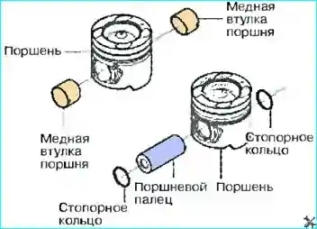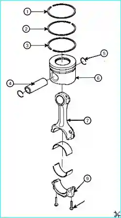 - - Проверить стопорное кольцо поршневого пальца на предмет наличия следов повреждений и деформации. Заменить стопорное кольцо при необходимости.