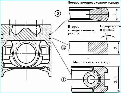 - - Расположить снятые поршневые кольца таким образом, чтобы избежать их дальнейшей неправильной установки.
