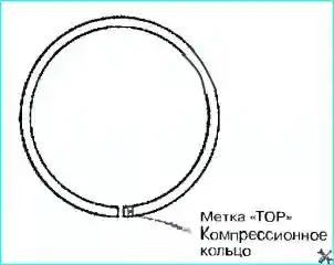 - - Установить компрессионные кольца таким образом, чтобы метка «ТОР» находилась вверху. Поршневые кольца должны перемещать плавно внутри установочных пазов поршня. После установки поршневых колец, необходимо проверить их боковой зазор и зазор замков поршневых колец.